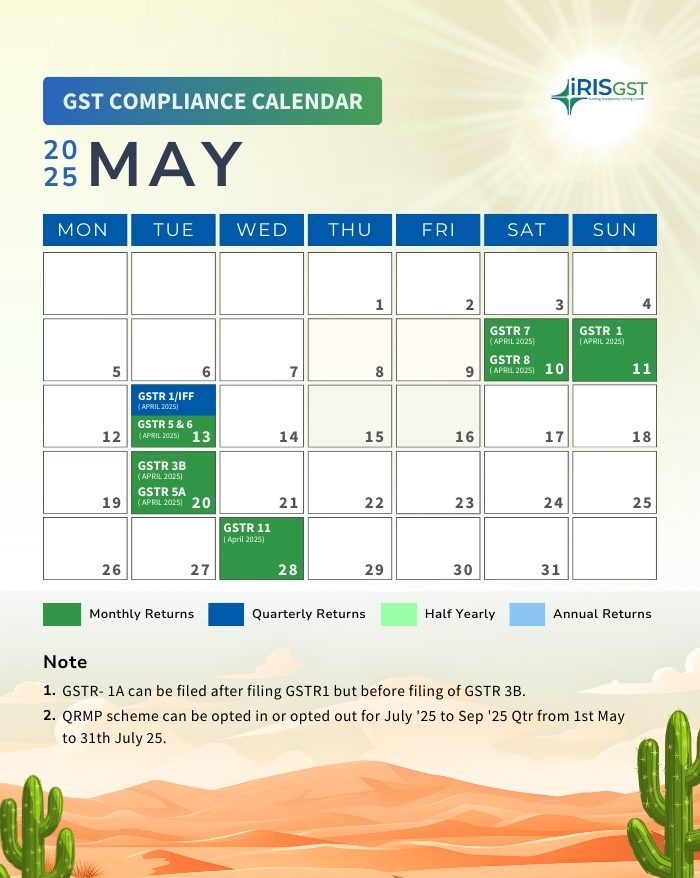 A comprehensive GST Compliance Calendar, curated for you to aid in adhering to GST regulations. It includes all the GST due dates for May 2025.